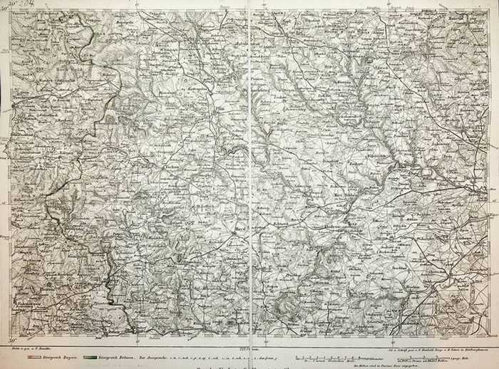 MIES (=BLATT Nr.: 204; G. D. Reymann's topographische Special-Karte von Central-Europa = G. D. Reymann's topographische Special-Karte von Deutschland, Schweiz, Ostfrankreich, Belgien, Niederlande, u. Polen Masstab 1:200000) Glogau, Verlag Carl Flemming, ca. 1870. Landkarte, Stahlstichkarte mit Grenzkolorit, Format: ca. 26 x35,5 cm, in 2 Segmenten auf Leinen gezogen; Entw. u. gez. v. F. Handtke. Sit. u. Schrift gest. v. G. Haubold , Berge v. H. Petters in Hildburghausen, Zustand: gut +. G. D. Reymann's topographische Special-Karte von Central-Europa = G. D. Reymann's topographische Special-Karte von Deutschland, Schweiz, Ostfrankreich, Belgien, Niederlande, u. Polen Masstab Ma?stab Massstab 1:200000, Spezialkarte, Spezial-Karte, Special-Karte, Specialkarte, 1:200 000, 1:200 000, Stahlstich, Landkarte, Begr?ndet von Daniel Gottlob REYMANN (1759-1837 ) weitergef?hrt von Karl Wilhelm von OESFELD(1781-1843) sp?ter von Friedrich HANDTKE (1815-1879).