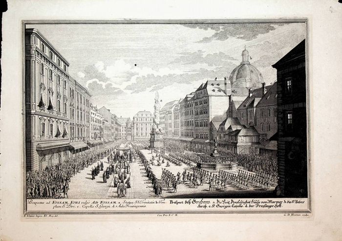 WIEN I, Graben, Titel: Prospect de? Grabens u.s.w. Augsburg, Johann Andreas Pfeffel, 1725. original Kupferstich von Georg Daniel Heumann nach Salomon Kleiner aus: Salomon Kleiner: Vera et Accurrata 2. Band, Blatt: ca. 28x40 cm, Platte: ca. 23x33,5 cm, kleines Loch in der Darstellung des Himmels. Nebehay/Wagner 306 II, 10.