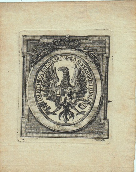 In Rahmen unter der Markgrafenkrone ein Oval mit Adler, auf dessen Brust sich zwei Wappenschilde befinden, darum Band mit Inschrift "Bibliotheca Gymnasii Carolo Alexandrini Onoldi". [um 1780]. 70 x 59 mm. Kupferstich, rückseitig kleine Montagereste und minimal gebräunt. Nicht bei Warnecke und Leiningen-Westerburg; Rosenthal 113. Das Karl Alexander Gymnasium wurde benannt nach dem Markgrafen von Brandenburg zu Ansbach-Bayreuth (1736-1806), der die Schule reich dotierte (siehe ADB 15, S. 264-266). - Gestochen hat das Blatt (Signatur in Spiegelschrift unten rechts) Johann Gottfried Köppel (1749-1798), der in Ansbach als Zeichnungs- und Schreibmeister nachgewiesen ist (siehe Nagler 7, S.125 und Meusel 11, S. 336-344). - seltenes Blatt.