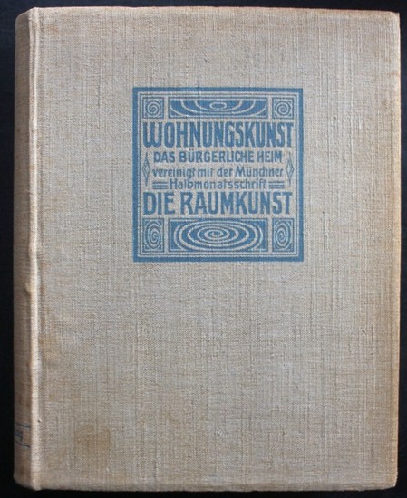 Wohnungskunst. Das bürgerliche Heim vereinigt mit der Münchner Halbmonatsschrift Die Raumkunst. Illustrierte Darmstädter und Münchner Halbmonatshefte für Wohnungskunst, Baukunst, Kunstgewerbe und verwandte Gebiete. IV. Jahrgang. Januar - Dezember 1912 Darmstadt, Verlag Wohnungskunst GmbH, 1912. gr 4°, illustr. Lwd., 480, 20 S. u. etwa 100 S. Anzeigenteil m. Gesamtinhaltsverzeichnis - Einband etwas angestaubt u. leicht fleckig, innen gut und sauber erhaltenes Exemplar. Teilw. mit eingebundenen Heftumschlägen. Diese in fehlerhafter Reiehnfolge.
