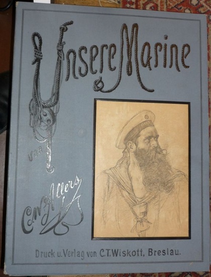 Unsere Marine. 50 Originalzeichnungen. Breslau, C. T. Wiskott, (ca. 1890). Folio (42 x 32 cm). 40 lose Taf. m. 50 mont. Abb. samt Bildunterschrift m. OUmschlag m. Inhaltsverzeichnis in blauer OLwd.-Mappe m. mont. Deckelillustr. u. geprägt. Deckeltitel. Mappe etw. berieben, kl. Stempel auf Lasche d. Kassette verso, kl. Fehlstelle im Laschenüberzug, Umschlagrücken etw. knitterig. Kl. Abklatsch v. Tesa an der ersten Tafel. Gutes Ex.