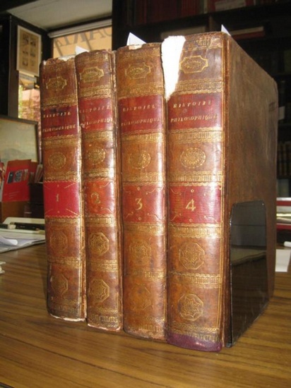 Histoire philosophique et politique des établissements et du commerce des européens dans les deux Indes. Tome premiere, second, troisieme e quatrième. A Genève, chez Jean-Leonard Pellet, 1780. 4 ° (26,5: 20,2 cm). Quatre volumes originaux tout en cuir avec des bords intérieurs, des cadres de couvercle, des dos et des ornements décorés d'or. XVI, 741 pages avec un frontispice gravé de l'auteur et une vignette de titre estampée et une autre en cuivre après S.84 / (4), VIII, 485 (1) avec une gest. Frontispice / XV, 624, 14 pages et une plaque de cuivre à S. 524e les 14 pages sur l?arrestation du Parlement / (4), VIII, 770 (+1) pages avec une gravure sur cuivre sur la page 18. Exemplaire général très bien conservé. Détails sur les volumes voir note! -- 4° ( 26,5 : 20,2 cm). Vier uniforme Original-Ganzlederbände mit goldverzierten Innenkanten, Deckelrahmungen, Rückentiteln und Rückenverzierungen. XVI, 741 Seiten mit gestochenem Frontispiz des Autors und gest. Titelvignette sowie einem weiteren Kupfer nach S.84 / (4), VIII, 485 (1) Seiten mit gest. Frontispiz / XV, 624, 14 Seiten und einer Kupfertafel nach S.524. die 14 Seiten zur Festnahme des Parlaments / (4), VIII, 770 (+1) Seiten mit einem Kupferstich nach Seite 18. Insgesamt durchaus gut erhaltenes Exemplar. Details zu den Bänden siehe Anmerkung!. Volume 1: Bords et joints légèrement raclés, coins percés, chapiteaux avec quelques millimètres manquants. Joint externe avant en haut et en bas environ 8 cm éclaté, de ce fait la couverture avant légèrement détendue. En raison du papier un peu sombre dans les marges, parfois des taches brunes. Propre et bien. Les volumes 2 et 3 sont identiques à 1, mais déchirés au niveau des articulations externes supérieures à environ 10 cm, toujours légèrement plus jaunâtres. Dans la bande 4, quelques marques de cuir complétées avec expertise, au niveau de la colonne vertébrale ci-dessus avec environ 7 x 5 cm manquantes. -- Band 1: Kanten und Gelenke etwas beschabt, Ecken durchstoßen, Kapitale mit wenigen mm Fehlstellen. Vorderes Aussengelenk oben und unten ca. 8 cm angeplatzt, dadurch der Vorderdeckel etwas gelockert. Papierbedingt im Randbereich etwas gedunkelt, vereinzelt braunfleckig. Sauber und gut. Bände 2 und 3 wie 1, aber an den oberen Aussengelenken bis ca. 10 cm eingerissen, durchgängig etwas mehr gelbfleckig. Bei Band 4 schon einige Lederstellen fachmännisch ergänzt, am Buchrücken oben mit ca. 7 x 5 cm Fehlstelle. FL5720.