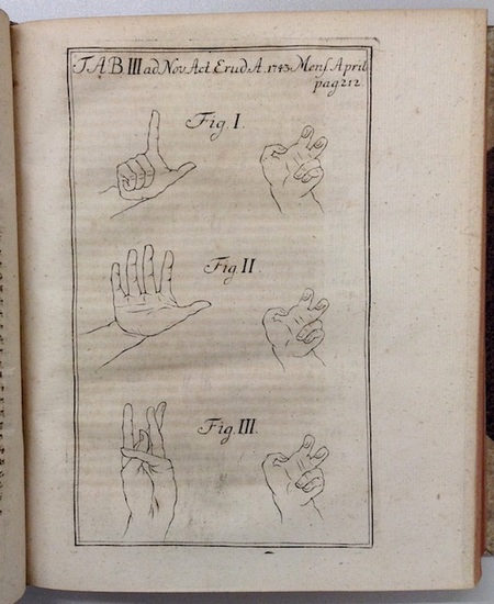 Nova acta eruditorum, anno MDCCXLIII publicata. Leipzig, Gleditsch & Lanckisch, 1743. 4to. 2 Bl., 720 S., 6 Bl. Mit 6 teils gefalteten Kupfertafeln. Halbpergament d. Zeit (berieben u. bestoßen, Rücken stark verstaubt). Mit einer umfangreichen u. mit einer Tafel u. zahlreichen Schriftbeispielen ausgestatteten Besprechung von Johann Georg Wachters "De alphabete naturae et leterarum". Ferner C. Wolffs "Jus naturae" Band 1 u. 2 (1740), Julius Ponderas "Antiquitatum latinarum graecarumque enarationes" (1740, mit einer Tafel), P. M. Doria "Dux belli philosophicus" (1739, mit einer Tafel) u. Swedenborgs "Oeconomia regni animalis", Band 2 (Amsterdam 1741). - Leicht gebräunt. Titel mit teils entferntem Namenseintrag u. verso alt gestempelt.