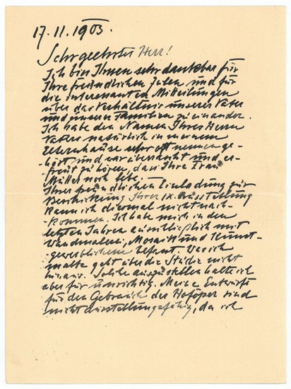 Eigenh. Brief mit U. O. O., 17. XI. 1903. 1? SS. auf Doppelblatt. Kl.-4to. Mit eh. adr. Kuvert. An Landesanstalten-Verwalter Josef Haier: "Ich bin Ihnen sehr dankbar für Ihre freundlichen Zeilen und für die interessanten Mitteilungen über das Verhältnis unserer Väter und unserer Familien zueinander. Ich habe den Namen Ihres Herrn Vaters natürlich in meinem Elternhause sehr oft nennen gehört und war überrascht und erfreut zu hören, dass Ihre Frau Mutter noch lebe [...] Ich habe mich in den letzten Jahren ausschließlich mit Wandmalerei, Mosaik und Kunstgewerblichem befaßt. Was ich malte geht über die Stücke nicht hinaus. Solche auszustellen halte ich aber für unrichtig. Meine Entwürfe für den Gebrauch der Hofoper sind nicht darstellungsfähig, da ich ihnen nur die Stellung von Hülfsmitteln zuerkenne, nicht aber einen Selbstzweck und ein Eigenleben [...]".