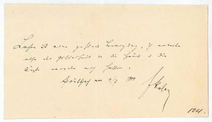 Eigenh. Albumblatt mit U. Pörtschach, 9. VII. 1880. 1 S. Qu.-8vo. "Lachen ist eine gesunde Bewegung, ich arbeite also der Gesundheit in die Hand u. die Ärzte werden mich hassen [...]". - Mit Akquisitionsvermerk von alter Sammlerhand verso, datiert 11. VII. 1880.