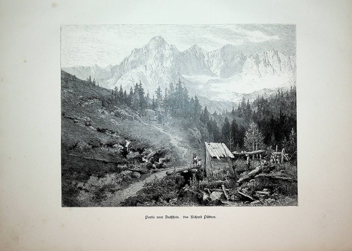 Steiermark, Dachstein, Dachstein S?dw?nde, Ansicht, Ansicht ca. 1880 originale Druckgrafik ca. 1880. original Xylographie von Adolf Clo? (1840-1894) u. a. nach der Zeichnung von Richard P?ttner (1842-1913), Blattformat ca. 26,5 x 36,5 cm. old Antique Print / originale Druckgrafik.
