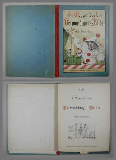 L. Meggendorfer's Verwandlungs-Bilder. Erste Vorstellung. Esslingen bei Stuttgart, Verlag von J.F. Schreiber., (1894). 35x26 cm. 16 n.n. S. mit 10 Textseiten und 6 doppelten Farbtafeln mit Verwandlungbildern mit Ziehmechanismus. Illustrierter Originalhalbleinwandband. Krahé 125. - Doderer II, 460. - Erste Ausgabe. - Ziehbilderbuch mit 6 Verwandlungstafeln: Das Gigerl auf dem Eis. - Der Neger in der Fremde. - Der Maler oder das unterbrochene Studium. - Der widerspenstige Esel. - Die Fischerin. - Der dumme August. - Fachgerecht restauriertes Exemplar mit 3 erneuerten (von 24) Ziehbändern und 3 faksimilierten Bilderstreifen. Alle Bilder spielbar. Innenfalz mit Leinenstreifen verstärkt. Einband an den Kanten leicht berieben. - Trotz der Restauration ein gutes und funktionstüchtiges Exemplar.