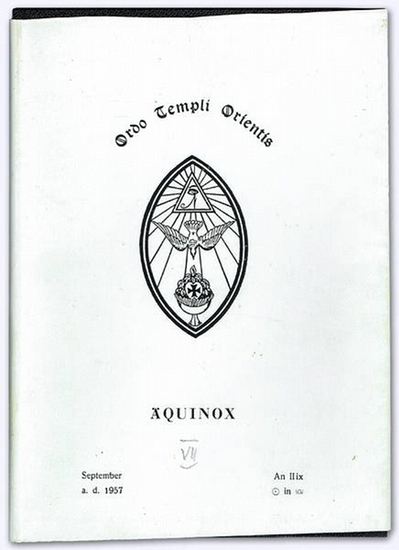 Äquinox [VII]. Ordo Templi Orientis [Deckeltitel]. Limitierte Aufl. von 1000 Expl., vorl. Nr. 36. Stein (AR, Schweiz), Verlag Psychosophische Gesellschaft, 1957. 40 S., 4 Bll., 8°, Schwarzes goldgepr. O-Leinen. Das Buch vom O.T.O. / Inhalt: Liber LII - Manifest des O.T.O. - Liber CI - Liber CXCIV / Weisungen in Bezug auf die Konstitution des Ordens. - Einziger schwarzer Band der ansonsten rot eingebundenen Äquinox-Reihe. - Umschlag schwach fleckig u. an der Oberkante unsauber beschnitten, sonst ein gutes Expl. - Selten!.