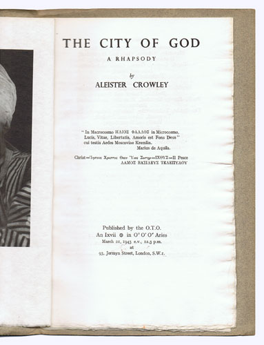 The City of God. A Rhapsody. 1st edition. London, Published by the O.T.O., 1943. 11 p., with frontispice, 4°, O-Paperback. Crowley Cross Index: C18 and Nr. 142. - It says: "This edition consists of 200 copies numbered and signed by the author." This copy is number 145, but NOT signed. Crowley did only sign some copies until he died; therefore signed copies indeed are rather scarce. - Little knocked; a good copy.