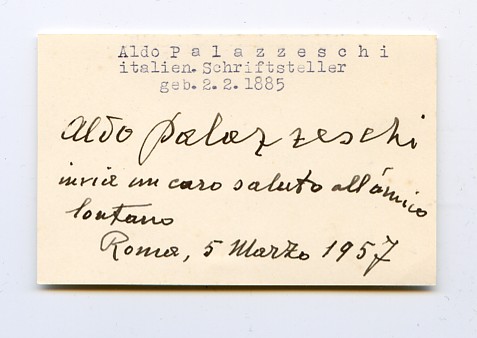 Eigenh. Albumblatt mit U. Rom, 5. März 1957. 1 S. Qu.-32mo. Beiliegend eine gedr. Visitenkarte. ?Aldo Palazzeschi | invia un caro saluto all?amico lontano?.