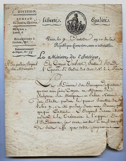 Brief mit eigenh. U. (?Chaptal?). ?Paris, le 9 Ventôse an 10 de la Republique francaise?, d. i. 28. Februar 1802. 1? SS. auf Doppelblatt. 4to. Mit Adresse (Faltbrief). An den ?Citoyen Dubois?, einen Maler. ? Jean-Antoine Chaptal bekleidete den Lehrstuhl für Chemie an der Medizinischen Fakultät von Montpellier Languedoc und wurde bekannt als Erfinder der ?Chaptalisation?, d. i. die Trockenzuckerung von Wein während der Gärung zur Erzielung eines höheren Alkoholgehalts; 1790 gab er dem zuvor entdeckten Stickstoff den Elementnamen ?Nitrogen? (= Salpeterbildner), wovon sich das heute verwendete Elementsymbol N ableitet. Nach dem Staatsstreich vom 18. Brumaire VIII wurde er von Napoleon zum Konsul ernannt und folgte 1801 Lucien Bonaparte als Minister des Inneren. ?Er führte das metrische System für Gewichte und Längenmaße ein und förderte Künste wie Wissenschaften [...] Chaptals Verdienst war die Wissenschaft populär zu machen und die Entdeckungen der Chemie in Industrie und Landwirtschaft praktikabel anzuwenden? (Wikipedia, Abfrage v. 26. IV. 2011). ? Auf Briefpapier mit gedr. Briefkopf; stark fleckig und mit kleineren Randausrissen.