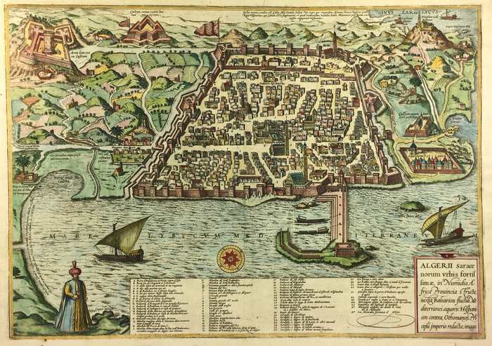 Algerii sarace norum urbis fortissimae, in Numidia Africa Prouinica s Fructe iuxta Balearios fluctus Mediterranci aequoris Hispaniam contra, Othomanor Pricipu imperio redache imago. (Algier). Köln, Gg. Braun u. Fr. Hogenberg ca. 1590. Altkolorierter Orig.-Kupferstich im Format 50,5 x 35 cm. unter Schrägschnitt-Passepartout. = Gg. Braun u. Fr. Hogenberg : Civitates Orbis Terrarum 1590 - 1612. Gut erhalten.
