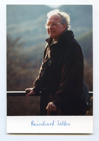Portraitphotographie mit eigenh. U. O. O. u. D. 149:98 mm. Hüftstück im ?-Profil in Farbe. ? Reinhard Selten hatte i. J. 1994 zusammen mit John Harsanyi und John Forbes Nash Jr. den Nobelpreis für Wirtschaftswissenschaften erhalten ?für ihre grundlegende Analyse des Gleichgewichts in nicht-kooperativer Spieltheorie?.