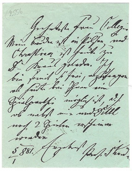 Eigenh. Brief mit U. [Wien], 5. Januar 1881. 1 S. auf Doppelblatt. Kl.-8vo. Bläuliches Papier. An eine "Frau Kollegin": "[...] Mein Bruder ist in Pilsen, und Chrastina ist heute zu Dr. Kraus geladen. Ich bin somit so frei, anzufragen ob heute bei Ihnen eine Spielparthie möglich ist, d. h. ob nebst mir und [dem Chirurgen Leopold von] Dittel noch 2 Spieler erscheinen werden [...]". - Skoda wurde bekannt für den Ausbau physikalischer Untersuchungsmethoden, besonders der Auskultation und der Perkussion. Er gilt als Neubegründer der physikalischen Diagnostik und führte gemeinsam mit Carl von Rokitansky die jüngere Wiener Klinische Schule an. Skoda trat entschieden für Ignaz Philipp Semmelweis' Lehre von der Ursache des Kindbettfiebers ein. Er verwandte für seine Vorlesungen erstmals die deutsche Sprache. Sein Hauptwerk ist "Abhandlung über Perkussion und Auskultation" (1839). - Aus der Sammlung Starkenstein. - Selten.