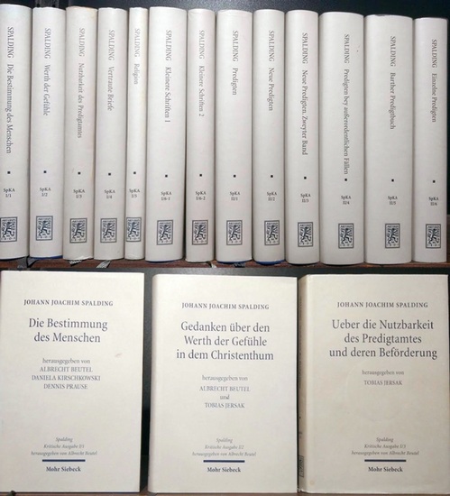 Kritische Ausgabe (SpKA). Herausgegeben von Albrecht Beutel. Erste Abteilung: Schriften 1-6/2 (in 7 Bänden) + Zweite Abteilung: Predigten (in 6 Bänden). - Vollständige Werkausgabe in 13 physischen Bänden. 13 Bände (= vollständig). Tübingen: Verlag Mohr Siebeck Verlag 2001-2013. Pro Band ca. 250-650 Seiten. Gr.-8° (23 x 15 cm). Orig.-Leinenbände mit Titelprägung auf Deckel und Rücken, Lesebändchen und Orig.-Schutzumschlägen. Bei einigen Bänden Widmung des Herausgebers auf dem Vorsatz. - Einige Bände etwas schiefgelesen, v.a. in der zweiten Abteilung (Predigten). Schutzumschläge mit minimalen Lagerspuren. Schnitte gelegentlich leicht angestaubt. Band I/3 (Homiletik) mit rundem Abdruck eines Glases (ohne Feuchtigkeitsspur, nicht sehr gravierend) auf Schutzumschlag und Vorderdeckel, dieser Band auch mit einigen, nicht ganz feinen Bleistiftanstreichungen (radierbar). Ansonsten nach sorgfältiger Sichtung keine Bleistiftanstreichungen, ganz ausgeschlossen werden können vereinzelte knappe Anstreichungen (radierbar) nicht. - Insgesamt sehr gutes und sauberes Exemplar. - Aufbau der Werkausgabe: Erste Abteilung: Band 1: Die Bestimmung des Menschen. - Band 2: Gedanken über den Werth der Gefühle in dem Christenthum. - Band 3: Über die Nutzbarkeit des Predigtamtes und deren Beförderung. - Band 4: Vertraute Briefe, die Religion betreffend. - Band 5: Religion, eine Angelegenheit des Menschen. - Band 6 Teilbände 1+2: Kleinere Schriften, Briefe an Gleim, Lebensbeschreibung. - Zweite Abteilung: Band 1: Predigten (1765, 1768, 1775). - Band 2: Neue Predigten (1768; 1770; 1777). - Band 3: Neue Predigten. Zweyter Band (1784). - Band 4: Predigten größtentheils bey außerordentlichen Fällen gehalten (1775). - Band 5: Barther Predigtbuch. Nachgelassene Manuskripte. - Band 6: Einzelne Predigten. - Compete set with minor signs of age and use. Slightly bend by lecture. Slightly dusted. Vol. I/3 with pencil marks.