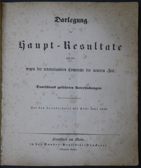Darlegung der Haupt-Resultate aus den wegen der revolutionären Complotte der neueren Zeit in Deutschland geführten Untersuchungen. Auf den Zeitabschnitt mit Ende Juli 1838. Frankfurt am Main, Bundes-Präsidial-Druckerei, ohne Jahr (1838). Ca. 24,3 x 20,8 cm. 75 Seiten. Kartoneinband (ca. 1900). Erste Ausgabe, anonym erschienen. Erman-H. I, 14688; nicht in der Slg. Friedländer. Einzigartige Darstellung der "Demagogenverfolgung" des "Jungen Deutschland" durch die "Bundeszentralbehörde", einer nach dem Frankfurter Wachensturm 1834 ins Leben gerufenen Nachfolgerin der Mainzer Zentraluntersuchungskommission. Berichtet detailliert (Namen, Lebensläufe, Zitate) über Burschenschaften, Preßverein, Hambacher Fest, Entstehung des "Jungen Deutschland" und besonders ausführlich über den Frankfurter Wachensturm. Auf Seite 63 heißt es: "Nun erschien eine, die oben genannten an Bösartigkeit weit hinter sich lassende Flugschrift: 'der Hessische Landbote'. Verfaßt war sie, wie aus den Aussagen geständiger Mitschuldiger hervorgeht, von dem Studenten Büchner". Kanten berieben, teils stockfleckig bzw. gebräunt.