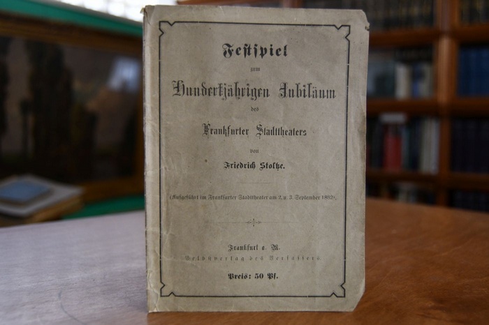Festspiel zum hunderjährigen Jubiläum des Frankfurter Stadttheaters [aufgeführt im Frankfurter Stadttheater am 2. u. 3. Sept. 1882]. Frankfurt a.M., Selbstverlag des Verfassers, [1882]. 30 S. 16 x 12 cm, Broschur. Einband berieben, bestoßen und mit Einrissen. Eselsohrig. Papierbedingt gebräunt. Sehr selten.
