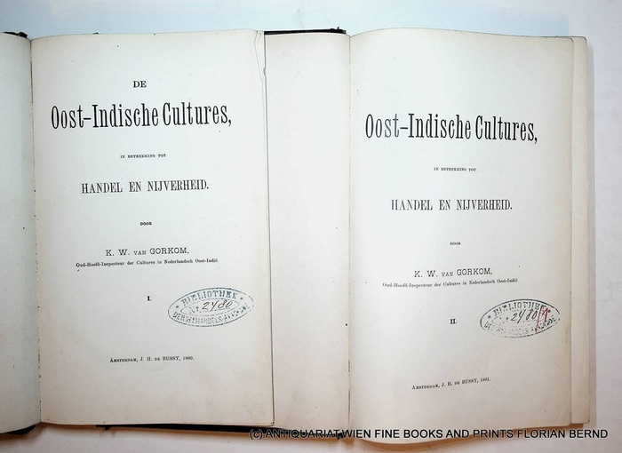 De Oost-Indische cultures, in betrekking tot handel en nijverheid Part 1 + 2 Amsterdam, Bussy, 1880 1881. 2 Halblederband der Zeit, gr.-8?, 508 Seiten; 657 SeitenZustand: gut Einb?nde berieben , Bibliothekstempel / bibliotheekstempel / cachet de biblioth?que / librarystamp.