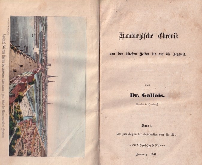 Hamburgische Chronik von den ältesten Zeiten bis auf die Jetztzeit. 5 Bände (= komplett). Hamburg, 1861-1864. 595; (597-)1341 S.; 2 Bll., 896 S.; 1 Bl., 987 S.; 4 Bll., XVI, 695 S. Mit 1 farb. lithogr. Frontispiz in Bd. 1 u. 5 (davon 3 teilkolor.) Falttaf. in Band 5. (21,5 x 14 cm). HALBLEINEN d. Zt. mit goldgepr. RTitel ("Hamburger Chronik"). [1] Bis zum Beginn der Reformation oder bis 1521. [2] Von der Reformation bis zum ersten Beginn der bürgerlichen Unruhen im Jahre 1618. [3] Vom Beginn der bürgerlichen Unruhen bis zur Vollendung des Hauptrecesses 1712. [4] Von der Vollendung des Hauptrecesses1713 bis zum großen Brande im Mai 1842 (Schluß). [5] Hamburgs neueste Zeit. 1843-1860 [= eigenständiger Nachfolgeband]. Das Frontispiz zeigt "Hamburg 1587, vom Thurme des äusseren Dammthors (jetzt Ecke des Gänsemarktes) gesehen; die Falttafeln zeigen: 1. Grundriß von Hamburg u. Umgebung 1842, vor dem Brande; 2. dass. 1863; 3. Siel-System von W. Lindley (bis 1863); 4. Stadt-Wasserkunst von W. Lindley (bis 1863); 5. Durchschnitt eines Theiles der Hermannstraße mit Häusern, worin Wasser u. Siele angelegt sind. - Ohne das Porträt Karls d. Großen u. 2 Stadt-Ansichten. - Nicht bei Schröder. - Rapp nur. 2. Ausg. 1870 (5 Bde. m. Ktn., S. 29, B. 21). - Einbände beschabt u. mäßig bestoßen, Papier durchg. gebräunt bzw. stockfleckig, alle Bde. mit StaV.