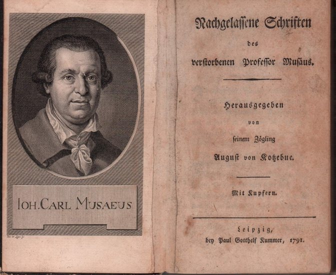 Nachgelassene Schriften des verstorbenen Professor Musäus. Hrsg. von seinem Zögling August von Kotzebue. Leipzig, Paul Gotthelf Kummer, 1791. IV, 235 S. Mit 2 gestoch. Tafeln. Kl.-8vo (16 x 10). Pp. d. Zeit. Erste Ausgabe. - Enthält u.a.: Modischer Lebenslauf eines unmodischen Kleinbürger, Lästige Polizeianstalten für Spaziergänger, den Novellenkranz "Briefe an Madame Gildemeister", Gelegenheitsdichtungen u.v.m. - Mit Porträttafel u. einer Darstellung des Grabmals von Musäus. - Bestoßen, Rückenpapierbezug tls. abgesplittert; Papier etwas stockfleckig, Falz zwischen Porträt-Tafel u. Titel mit einem Papierstreifen verstärkt.