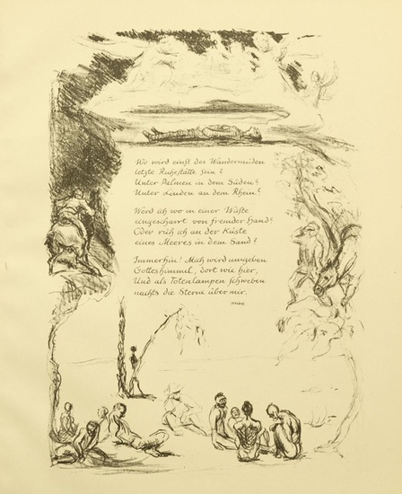 Gedicht von Heinrich Heine "Wo wird einst des Wandermüden letzte Ruhestätte sein?" Lithographie aus "Der Bildermann", 1916. 29,5x21 cm, in der linken unteren Ecke: "Der Bildermann - Fünftes Lied", ohne Rückentext.