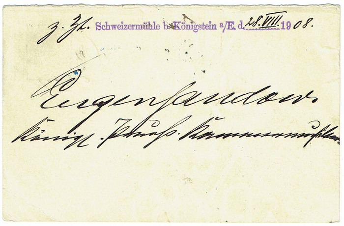 Eigenh. Unterschrift auf der Rückseite einer Postkarte. Königstein, 28. VIII. 1908. Quer-kl.-8vo. 1 p. Postgelaufen. Die Unterschrift auf der Rückseite der Karte. Aug der Rückseite die gestempelte Adresse.