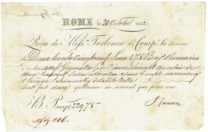 Gedr. Quittung mit eigenh. Unterschrift. Rom, 20. X. 1832. Quer-8vo. 1 p. Gebräunt. Bestätigung über den Erhalt von 229 Romains.