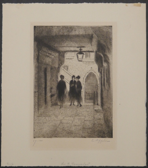 Bei St. Barnabas. _. Original-Radierung und Kaltnadel. Von Ernst Oppler signiert und numeriert. Wohl von fremder Hand mit Bleistift am unteren Rand datiert (XI 17) und betitelt. Ca. 17,2 x 12,2 cm (Plattenformat; ca. 26 x 22 cm (Papierformat). Nr. 67 von 100 nummerierten Exemplaren. Breitrandiger Abdruck auf chamoisfarbenem Bütten. Innerhalb des alten Passepartout-Ausschnitts etwas gebräunt, am oberen Rand alte Montagespuren.