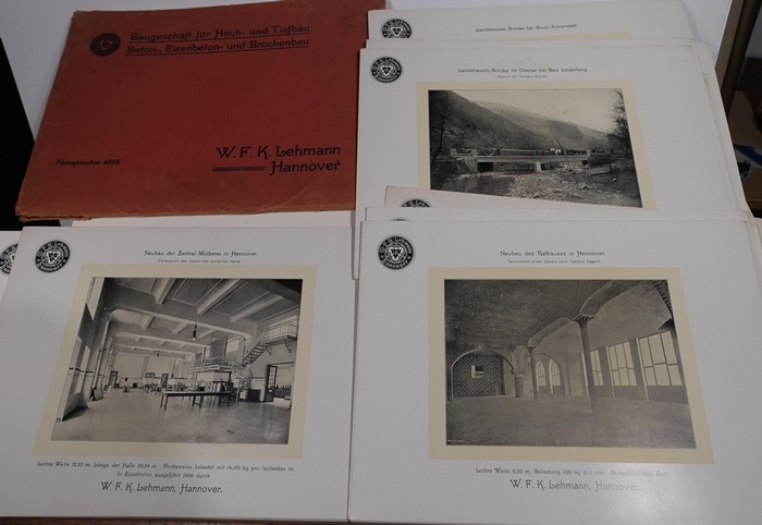 Hoch- und Tiefbau, Brückenbau in Niedersachsen, Werbeprospekt --- "Baugeschäft für Hoch- und Tiefbau, Beton-, Eisenbeton- und Brückenbau W.F.K. Lehmann, Hannover, Fernsprecher 4695. " -- Mappe mit 19 lose einliegenden Tafeln mit 1904-1909 ausgeführten Bauten des Unternehmens (Brücken sowie Zentralmolkerei und Neues Rathaus Hannover), dazu ein Entwurf von 1910. Hannover o.J. (um 1910). Pappmappe mit 18 einliegenden Tafeln im Format 20,3 x 28,3 cm und einer gefalteten Tafel im Format 28,5 x 47 cm, jeweils auf dünner Pappe. -- Zustand: Mappe fleckig und etwas schadhaft; Tafeln etwas fleckig. Abgebildet sind Motive vom Neuen Rathaus in Hannover und der Zentralmolkerei Hannover; daneben zahlreiche Brücken: Kardenapps Brücke über die Ise bei Gifhorn, Landstraßen-Brücken bei Groß-Schierstädt, über die Große Nister bei Korb im Westerwald, über die Ellbach bei Guckheim und im Odental bei Bad Lauterberg sowie Brücken über die Eisenbahn bei Elze und bei Rohrsen-Hameln (meist mehrere Motive eines Bauwerks). -- Die große Tafel zeigt die "Fußgängerbrücke über den Weserdurchstich für die Staustufe bei Börverden" (ausgeführt 1909); der Entwurf von 1910 eine "Eisenbeton-Brücke über die Lahn bei Gräfeneck-Weilburg im Westerwald.".