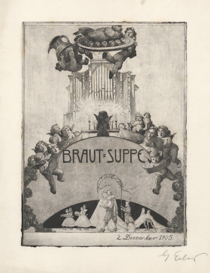 Braut-Suppe. _. Radierung und Mischtechnik, 1905, signiert. 27,8:20,2 cm. Vorzüglicher Abdruck auf Kupferdruckpapier. Erler, der seine Studien in Dresden, Paris, Rom und München absolvierte, war Gründungsmitglied der Künstlergruppe ?Die Elbier? und 1913-1937 Professor an der Dresdener Kunstgewerbeakademie. Die Graphik, besonders die Radiertechnik, nimmt eine herausragende Position in seinem Gesamtschaffen ein.