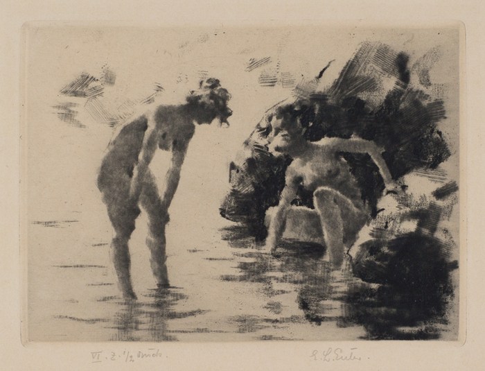 Zwei unbekleidete Frauen im seichten Wasser an felsiger Küste nach Muscheln suchend. _. Aquatintaradierung, auf gelblichem Papier, rechts unterhalb der Darstellung in Bleistift signiert ?E.L.Euler?, links unterhalb der Darstellung bezeichnet ?VI . Z . ??. Plattengröße 15,5:21,4 cm, Blattgröße 21,1:25,3 cm.- Verso datiert ?17.11.1922? und nochmals bezeichnet. Sehr schöner Druck des 6. Zustandes, 1. Exemplar von 2.
