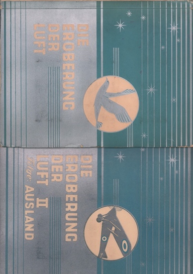 Die Eroberung der Luft. Bildersammlung der Garbáty Cigarettenfabrik. 2 Bde. (= komplett). Berlin-Pankow, Garbáty Cigarettenfabrik, 1932. 39; 36 S. Mit zus. 19 farbigen illustr. Bl., 460 montierten farb. Flugzeugbildern, 1 Bl. u. 1 farb., mehrfach gefalt. Modellbogen. 30 cm. Illustr. OKart. mit Silberdruck u. Silberprägung. Köberich 20703/5+6. - [1.]: Die Eroberung der Luft; [2.]: Die Eroberung der Luft II. Folge: Ausland. - Bilderalbum, KOMPLETT mit dem seltenen Falz-Flugzeug-Modellbogen (Junkers F-13). im 2. Band. - Außen schwach gebräunt, ein VDeckel gerändert. sonst gut.