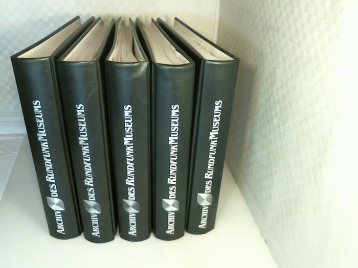 Archiv des RundfunkMuseums. Herausgegeben vom Deutschen Rundfunk-Museum e.V. in Berlin. 5 Bände, Archiv-Verlag, Braunschweig ohne Jahresangabe (1992 ff). ca. 150 kartonierte Blätter (300 Seiten) je Band mit zahlreichen Bildtafeln und Abbildungen, Faksimiles und Begleittext, 4°, Loseblattsammlung in Original-Kunstleder-Sammelordner, gute und innen saubere Exemplare,. Dieses Sammelwerk von bibliophilen Rang enthält zahlreiche Abbildungen von Rundfunkggeräten mit technischen Daten, Schaltplänen und begleitendem Text. Es erschien in zahlreichen Einzellieferungen in limitierter Auflage. Offenbar vollständige Sammlung (nicht eingehend kollationiert).