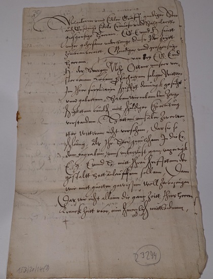 Handschrift Brief Pößneck (Thüringen), Ernennung Pfarrer Melchior Bischoff --- Umfangreicher Brief vom Rat der Stadt Pößneck an die Regierung in Coburg, eine Bitte um Einstellung des Pfarrers Melchior Bischoff betreffend, der schon vorher Diakon in Pößneck gewesen war. Die Vorzüge dieses Pfarrers werden ausführlich geschildert. Pößneck 1585. Deutsche Handschrift auf Papier, datiert Pößneck, 8. August 1585. -- Umfang: sechs Textseiten (33,3 x 20 cm); auf der achten Seite Adressierung (mit Trockensiegel). -- Zustand: Leicht fleckig, Siegel etwas schadhaft. Melchior Bischoff (* 20. Mai 1547 in Pößneck; gest. 19. Dezember 1614 in Coburg) war ein deutscher evangelischer Kirchenlieddichter und Geistlicher. Leben: Melchior Bischoff, Sohn eines Schuhmachers, arbeitete seit 1568 an der Stadtschule in Rudolstadt als Lehrer und war danach als Kantor in Altenburg tätig. 1570 in seiner Heimatstadt zum Diaconus ernannt, wurde ihm 1574 von Visitatoren sein Amt entzogen, weil er die philippistischen Artikel nicht anerkannte. Nachdem er in Geckenheim sowie seit 1579 in Thundorf als Pfarrer tätig gewesen war, übernahm er eine Pfarrstelle in Franken. Nachdem die Philippisten gestürzt worden waren, wurde er 1585 in Pößneck als Pfarrer angestellt. 1590 wurde Bischoff nach Coburg berufen, um Hofprediger zu werden. Am 16. Dezember 1594 hielt er die Leichenpredigt für Elisabeth, die Gemahlin Herzog Johann Friedrichs, und am 16. November 1595 für Herzog Johann Friedrich selbst. Beider Leichname waren aus der österreichischen Gefangenschaft nach Coburg gebracht worden. Er wurde 1597 zum Superintendenten von Eisfeld und 1599 zum Generalsuperintendenten von Coburg ernannt. Am 16./17. September 1599 gab er der zweiten Ehe des Herzogs Johann Casimir (Sachsen-Coburg) mit Margarethe von Braunschweig-Lüneburg in Coburg den kirchlichen Segen. Bischoff dichtete mehrere Lieder, die in Coburger Gesangbüchern veröffentlicht wurden. Am 19. Juli 1620 hielt Melchior Bischoff die Leichenpredigt für den verstorbenen Herzog Friedrich Wilhelm I. Einige seiner Predigten wurden gedruckt und sind digital verfügbar. Werke: Das Leben für uns in den Tod gegeben; Vom ewigen Leben der Auserwelten Gottes: 8 Predigten (1597). (Quelle: wikipedia.).