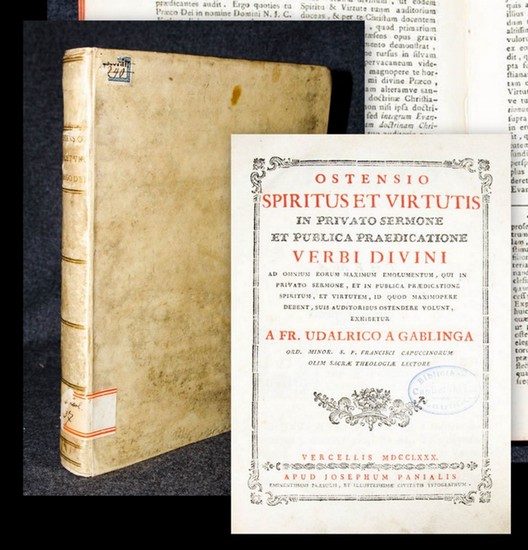 Imago dei immortalis anima rationalis ad expressionem aeternae rationis facta evidenter spiritualis et evidenter immortalis omni homini demonstratur... Editio secunda. Cagliari, Ex Regia Typographia, 1777. 4°, circa 22,6 x 17,5 cm., 6 ff., 149 pp., 5 ff., title in red and black. Contemporary vellum Rare imprint from Cagliari in Sardinia, the book had before come out in 1772 in Venice. The franciscan theologian Udalricus a Gablinga or Ulrich von Gablingen (born Benedikt Reitmair, 1722-1800) was born near Augsburg and presumably taught in northern Italy, where several of his books were published. - Here BOUND WITH: Ulrich von Gablingen. Ostensio spiritus et virtutis in privato sermone et publica praedicatione verbi divini... Vercelli, Panialis, 1780. 6 ff., 107 pp. - Two elegant imprints from Cagliari and Vercelli with rare theological tracts by a member of the Order of Capuchin Friars Minor (Ordo Fratrum Minorum Capuccinorum). - Only the Vercelli title with older German stamp, minor browning, little spotting, binding soemwhat rubbed or dusty, but altogether fine.