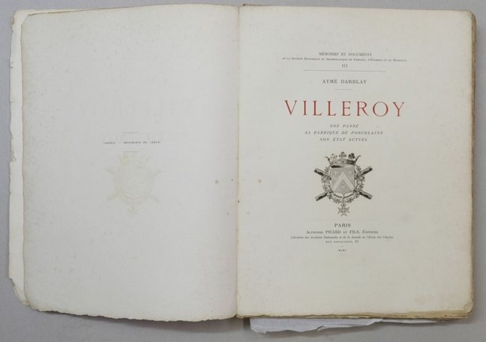 Villeroy, son passé, sa fabrique de porcelaine, son état actuel. (Mémoires et Documents de la Société historique et archéologique de Corbeil, d'Etampes et du Hurepoix : III). Alphonse Picard et Fils, Paris, 1901. Gr.-4°, 98 S. + 47, teils doppelblattgroße Tafeln, lose in Lagen in Interimsbroschur (Tafeln fleckig) (Villeroy & Boch) **Das abgegangene Schloss Villeroy in der Gemeinde Mennecy war das. Zentrum des Herzogtums Villeroy und damit der Sitz der Herzöge von Villeroy aus der Familie Neufville de Villeroy. 1735 wurde unter Protektion des Herzogs Louis François Anne von François Barbin eine Porzellanmanufaktur gegründet. (ISCH).