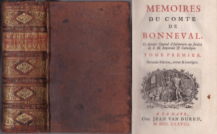 Mémoires Du Comte De Bonneval, Ci-devant General d'Infanterie au service de S. M. Imperiale [et] Catholique. Tome Premier e Second. Seconde édition, revue & corrigée. Beigebunden: I: Nouveaux memoires du Comte de Bonneval, contenant ce qui lui est arrivé de plus remarquable durant son séjour en Turquie / II: Critique ou analyse des Mémoires du Comte de Bonneval Ci-devant General d`Infanterie au Service de sa M. I. & Catholique présentement Renegat, & Bachat à Trois Queues en Turquie, Amsterdam [i. e. Leipzig], Au depans de la Societé de Marche 1738. La Haye, Jean van Duren, 1738. kl 8°, Ganzledereinbd. m. goldgeprägtem Rücken u. Zierbünden, 256 S.; 248 S. / 269 S. / 7 Bl., 192, 77 S. - Rücken etwas berieben u. bestoßen, Innendeckel m. Ex Libris, ersten Seiten mit kleinem braunen Fleck, sonst innen sauberes u. gutes Exemplar Rare Kompilation der Erinnerungen Bonnevals einschließlich seines Aufenthalts in der Türkei mit der seltenen kritischen Analyse seines Berichts.