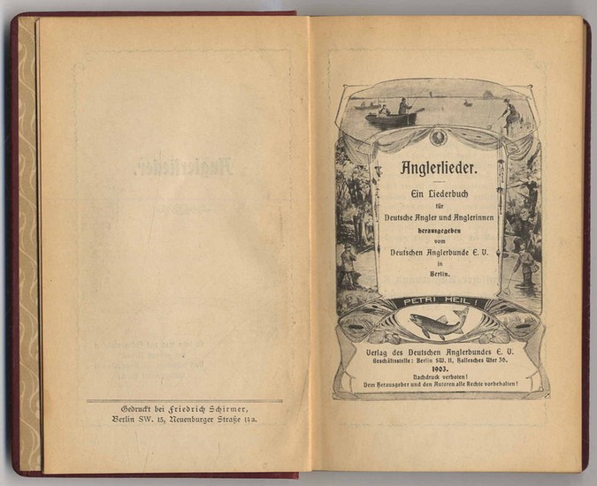 Anglerlieder. Ein Liederbuch für Deutsche Angler und Anglerinnen herausgegeben vom Deutschen Anglerbunde E.V. in Berlin. Berlin, Verlag des Deutschen Anglerbundes, 1903. Ca. 17 x 10,5 cm. XV S., 228 S., (28 Seiten). Mit einigen Illustrationen. Roter Orig.-Leinenband. Seitenränder leicht gebräunt. "Dem Fischerei-Verein für die Provinz Brandenburg zur Jubiläumsfeier des fünfundzwanzigjährigen Bestehens des Vereins in freundschaftlicher Gesinnung zugeeignet vom Deutschen Anglerbund." Gutes Exemplar des seltenen Liederbuches.