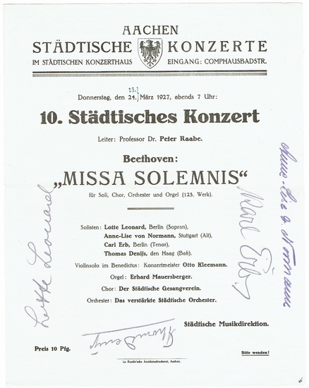 Programm mit eigenh. Unterschriften. Aachen, 24. III. 1927. 4to. 1 p. Bleistift. Eigenh. Unterschrift auf einem Programm im Städtischen Konzerthaus in Aachen. Aufgeführt wurden unter der Leitung von Peter Raabe Beethovens Missa Solemnis. Signiert von den Solisten Lotte Leonard, Anne-Lise von Normann, Carl Erb und Thomas Denijs.