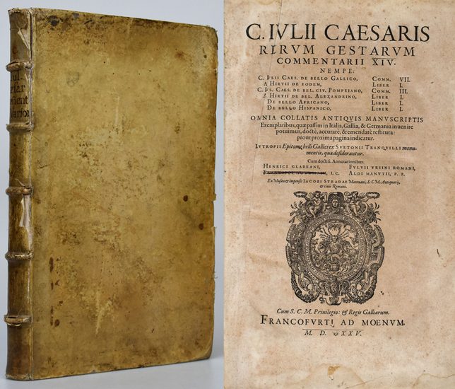 Rerum Gestarum Commentarii XIV. Nempe: C. Iulii Caes. de Bello Gallico, Comm. VII. A. Hirtii de Eodem, Liber I. C. Iul. Caes. de Bel. Civ. Pompeiano, Comm. III. A. Hirtii de Bel Alexandrino, Liber I. De Bello Africano, Liber I. De Bello Hispanico, Liber I. Omnia Collatis Antiquis Manuscriptis Exemplaribus, quae passim in Italia, Gallia, & Germania inuenire potuimus, docte, accurate, & emendate restituta [...]. 3 Teile [in 1 Band, komplett]. Frankfurt, von Corvinus für Strada, 1575. 2°. 37 x 25 cm. [12] Blatt, 265 Seiten, [12] Blatt, 35, 207 Seiten. Schweinslederband der Zeit auf fünf Bünden mit handschriftlichem Rückentitel in Tinte. Erste umfassende Gesamtausgabe in der Bearbeitung von Strada. Graesse II, 7. Schweiger II,1, 43. Mit einer Titelvignette und einer Druckermarke in Holzschnitt und 30 Textholzschnitten (darunter ein Wappenholzschnitt und Stadt- und Belagerungsansichten, 2 Textholzschnitte doppelblattgroß), und zahlreichen figürlichen Holzschnittvignetten und -initialen. "Der Text ist der der Vaccosana mit wenigen Änderungen. Sehr geschätzt. Die Holschn. sind trefflich." (Schweiger ibidem). Einband berieben und stellenweise beschabt und etwas fleckig, vorderes Außengelenk weit eingerissen (Deckel und Bindung jedoch fest), Titelblatt und hinterer Vorsatz mit Streichung bzw. Namenslöschung von alter Hand in Tinte, Vakatblätter, Titelblatt und letzte Seite mit einzelnen kleinen Wurmlöchern (minimaler Textverlust einzelner Buchstaben) und die letzten Seiten zusätzlich mit kleinerer Eckfehlstelle, Seiten durchweg mäßig bis stellenweise stärker gebräunt und etwas stockfleckig, die letzten 50 Blatt etwa mit blassem Wasserrand im Außensteg (ohne Textberührung), ansonsten gutes Exemplar. Leather binding of the times with handwritten title on spine. First comprehensive complete edition by Strada. Graesse II, 7. Schweiger II,1, 43. With a title vignette and a printer's mark in woodcut and 30 text woodcuts (including a coat of arms woodcut and city and siege views, 2 text woodcuts double-sheet size), and numerous figurative woodcut vignettes and initials. "The text is that of Vaccosana with a few changes. Highly appreciated. The wood engravings are excellent." (Schweiger ibid). Cover rubbed, partly scuffed and a bit stained, front hinge torn (cover and binding nevertheless firm), title page and rear endpaper with deletions by an old hand in ink, blank pages, title page and last page with few small wormholes (minimum text loss of single letters) and the last pages additionally with a small corner defect, pages throughout moderately to partially strongly darkened and slightly foxed, the last 50 sheets with pale tidemarks to the outside margin (without touching the text), otherwise a good copy.