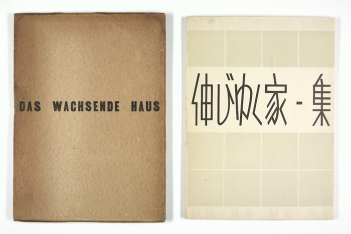 Nobiyuku ie shyû (Das Wachsende Haus - Sammlung der Modularbauwerke). Nobiyuku ie no tenrankai sakuhinshyû. Ôsaka, Nobiyuku ie tenrankai jimushyo, (Mai) 1933. 26 x 19 cm. 1 nn. Bl., 44 S., 1 nn. Bl. mit zahlr. s/w Fotoabb. und Grundrissen sowie 1 Farbillustr. Typogr. gestalteter OPpbd. (Rücken ger. restauriert) im Orig.-Schuber mit Titel in deutscher Sprache, 51158AB. (dieser gebräunt, kl. Verletzungen restauriert). Katalog zu der bisher in der Literatur unbekannten japanischen Bauausstellung "Das wachsende Haus", die 1933 in Itami im Midorigaoka-Koen Park gezeigt wurde. Von der gleichnamigen Ausstellung in Berlin und Wien (1932) wurden das Konzept und der Titel adaptiert. Der erste Teil des Buchs widmet sich den japanischen Entwürfen. Der zweite zeigt Beiträge der Berliner und Wiener Ausstellung, vertreten durch Taut, Gropius, Klein und Bartning (für Berlin) sowie Gascard, Köhler, Pongen, Fuchs u. Baltenstern (für Wien). Im letzten Kapitel werden noch einige konstruktive Details der Modulbauweise aufgezeigt.- Außerordentlich selten!.