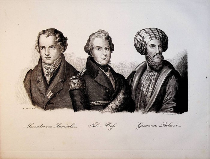 Gruppenbildnis des Alexander von HUMBOLDT, Giovanni Battista BELZONI, John ROSS [1843]. Gruppenportrait, original Kupferstich von Neumayer nach Schein,Blatt ca. 21 x 17 cm.