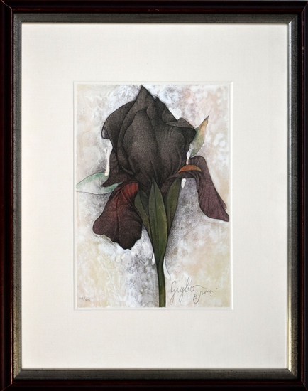 Giglio (Iris). 1990. [Signierte Original-Farblithografie, gerahmt / signed original color lithograph, framed]. _. Bruno Bruni, geboren am 23. November 1935 in Gradara bei Pesaro/Italien. Maler, Grafiker und Bildhauer. Nummer 146 von 800 von Bruno Bruni nummerierten, beschrifteten und signierten Original-Farblithografien auf Velin. Maße Blatt/Abbildung: 32,0 x 24,0 cm. Maße Rahmen: 56,5 x 48,5 cm. Rahmen minimal berieben. Sehr gutes Exemplar.