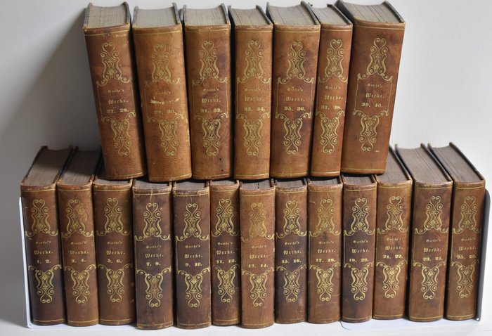 Goethe`s sämmtliche Werke in vierzig (40) Bänden. Unter des durchlauchtigsten deutschen Bundes schützenden Privilegien. Stuttgart und Tübingen, Cotta`scher Verlag 1840. Vollständig, neugeordnete Ausgabe. ca 12000 S; 15cm Halbleder. 0 Zustand: goldgeprägte Halblederbände der Zeit (ein Band mit zwei Wurmlöchern, einer stärker am Rücken berieben), Lederecken (bestoßen), Bindung intakt und fest, Namenseintrag Jos. Boeschen, durchgehend mehr oder weniger fleckig, Papier hell, Frakturschrift --- Inhalt: Mit Abbildungen im Text und auf Tafeln. 40 Bände in 20 Büchern. HZ2-5.