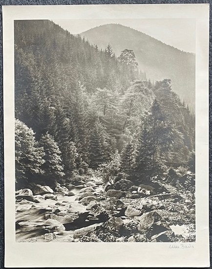 Original-Fotografie einer Berglandschaft. Rechts unterhalb der Darstellung von Max Baur mit Bleistift signiert. _. Ohne Jahr, ca. 1940. Gelatinesilberabzug. Ca.. 25 x 20,5 cm (Darstellung), ca. 29,5 x 23,2 cm (Papierformat). Leicht ausgesilbert, kaum sichtbare Knitterspuren.
