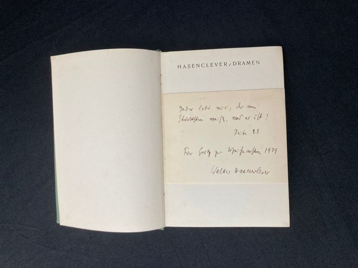 Dramen - Widmungsexemplar. Berlin, Die Schmiede 1924. Orig.-Leineneinband (Georg Salter). 291 S. 8°. Einband stärker fleckig. Vortitel mit montierter Widmung des Autors: "Jeder lebt nur, der am Stärksten weiß, wer er ist! Seite 28 Für [ß] zu Weihnachten 1929 Walter Hasenclever". Erste Ausgabe. Raabe II, 116, 16. Enthält die Dramen "Der Sohn", "Jenseits", "Die Menschen".
