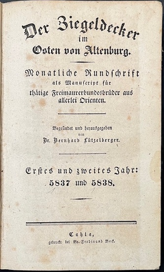 Der Ziegeldecker im Osten von Altenburg. Monatliche Rundschrift als Manuscript für thätige Freimaurer aus allerlei Orienten. Begründet und herausgegenen von Dr. Bernhard Lützelberger. Erstes und zweites Jahr: 5837 und 5838. Drittes Jahr: 5839. Cahla [Kahla], grdruckt bei Br. Ferdinand Beck, ohne Jahr (1837-1839). Ca. 20 x 12,5 cm. 6 Seiten, 228 Seiten; 192 Seiten. Dunkelblauer Leinenband der Zeit. Die ersten drei Jahrgänge der Zeitschrift, die nur als Manuskript für Brüder erschien. Einband berieben und mit kleiner Fehlstelle im Leinen, teils etwas stockfleckig.