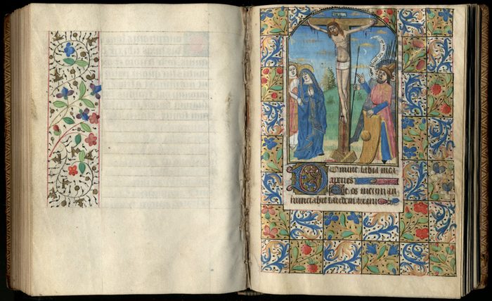 Stundenbuch. Handschrift auf Pergament. Wohl Nordfrankreich, letztes Viertel 15. Jahrhundert. _. * 155 (statt ca. 170) Blatt. Blattgröße 15,5 x 11,5 cm. Schriftraum meist 9,5 x 6,5 cm. Einspaltig. 16 Zeilen zart mit roter Tinte vorgezeichnet. Schrift durchgehend in braunschwarzer Tinte von einer Hand, Hervorhebungen in Rot. Mit einer großen Miniatur zum Kreuzoffizium (Darstellung der Kreuzigung), einer kleineren Miniatur (Kreuztragung) und 4 historisierten Initialen (darunter 2 Darstellungen einer betenden Frau, wohl die Besitzerin der Handschrift), jeweils in Gold und Farben. Durchgängig (auf jeder Seite!) breite mehrfarbige Bordüren mit Akanthusranken, Blumen und Früchten; durchgehend Initialen und Zeilenfüller in Gold, Blau und Rot. Kalbslederband des 18. Jahrhunderts über fünf echten Bünden (beschabt und bestoßen, Außengelenke angeplatzt) mit Rücken-, Deckel-, Stehkanten- und Innenleistenvergoldung, goldgeprägtem Rückentitel "Heures" sowie Goldschnitt. *** Stundenbuch nach dem Brauch von Paris. Enthält: Pariser Kalender; Evangelien-Lesungen; Mariengebete "Obsecro te" und "O intemerata"; Marienoffizium; Bußpsalmen mit Litanei; Offizium zur Unbefleckten Empfängnis Mariae; Kreuzoffizium; Totenoffizium; Zwei französische Gebete; Lateinische Gebete, u.a.: Heiligengebete; Gebet zu Christus; Ablassgebet; am Schluss Ergänzungen zum Marienoffizium (Lektionen 4-9 zur Matutin). - Alter Besitzeintrag am Beginn des Kalenders: "Stapleton de Garselles". - Etwa 15 Blatt fehlen, darunter vermutlich 7 Miniaturen und 6 historisierte Initialen. - Innen durchgängig sauber und außergewöhnlich gut erhalten. - Provenienz: Leipziger Privatsammlung.
