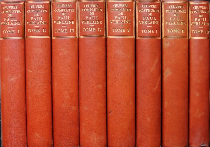 Oeuvres complètes (5 tomes) & oeuvres posthumes (3 tomes). [8 volumes - complet] Paris, Albert Messein, 1911. Éditeurs: Léon Vanier & Albert Messein 1911-1919. Tome 1: Poèmes saturniens. Fêtes galantes. Bonne chanson. Romances sans paroles. Sagesse. Jadis et Naguère. / Tome 2: Amour. Bonheur. Parallèlement. Chansons pour elle. Liturgies intimes. Odes en son honneur. / Tome 3: Elégies. Dans les limbes. Dédicaces. Epigrammes. Chair. Invectives. / Tome 4: Les poètes maudits. Louise Leclerq. Les Mémoires d'un veuf. Mes hopitaux. Mes prisons. / Tome 5: Confessions. Quinze jours en hollande. Les Hommes d'aujourd'hui. / Posthumes I: Vers de jeunesse. Varia. Parallèlement (additions). Dédicaces (additions). Souvenirs. Histoires comme ça. / Posthumes II: Charles Baudelaire. Voyage en France par un français. Souvenirs et Promenades. Quelques vers inédits. Critique et Conférences. Dessins de Paul Verlaine. / Posthumes III: Vers inédits. Critique et Conférences. Appendice.
