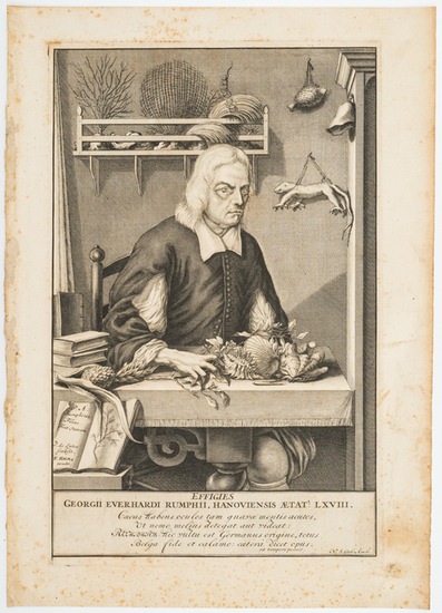 Georgii Everhardi Rumphii, Hanoviensis aetat:s LXVIII. - [Georg Eberhard Rumpf]. - [Um 1720]. Kupferstich 29 x 21,5 cm, Blattgröße 39,5 x 28 cm. Der Kupferstich von Jacob de Later, gezeichnet von P. A. Rumphius, zeigt den erblindeten Georg Eberhard Rumpf an einem Tisch sitzend. Auf dem Tisch Bücher, Pflanzen und Tiere, an der Wand hängend weitere Tiere und ein Regal mit Pflanzen und Korallen. Vor dem Tisch in einem aufgeschlagenen Buch P.A. Rumphious Filius Fcit Patrem , J. de Later sculpsit und F. Halma excudit. Unter Bild und Titel 4 Zeilen lateinischer Text von N. S. Gub. - Georg Eberhard Rumpf, 1628 - 1702, Naturforscher, Offizier, Botaniker, Forschungsreisender und Konsul. Er erkrankte an grauem Star und erblindete. In der Zeit erhielt ervor allem durch seinen Sohn Unterstützung bei seiner Arbeit. Das vorliegende Portrait wurde in mehreren Werken veröffentlicht. - Das Papier leicht gebräunt, stockfleckig und fleckig. Der Druck klar und kraftvoll.
